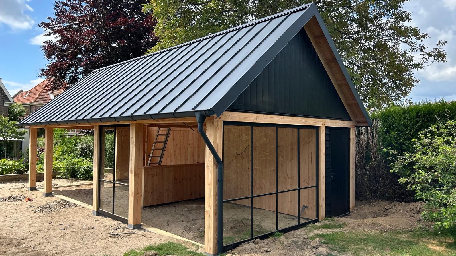 Voor dit particuliere buitenverblijf heeft AK Deuren en Montage het volledige dak afgewerkt met hoogwaardige felsplaten in de kleur slate grey. Deze strakke en duurzame afwerking geeft het buitenverblijf een moderne uitstraling en zorgt voor een lange levensduur met minimale onderhoudsbehoefte. Naast de felsafwerking hebben we ook de complete goten geleverd en gemonteerd. Dankzij deze waterdichte oplossing is het buitenverblijf uitstekend beschermd tegen weersinvloeden en blijft de constructie in optimale staat.